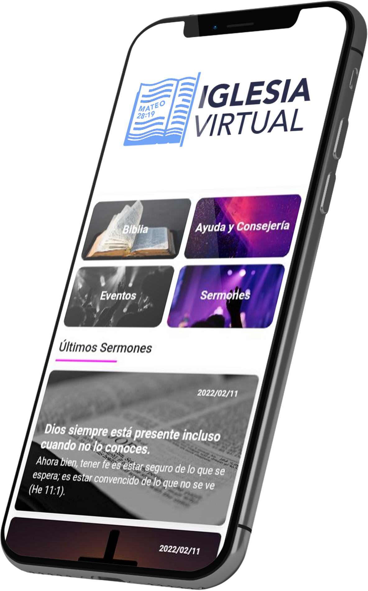 La aplicación móvil tendrá el logotipo y diseño de su iglesia, el cual podrá cambiar en cualquier momento desde la sección administrativa.