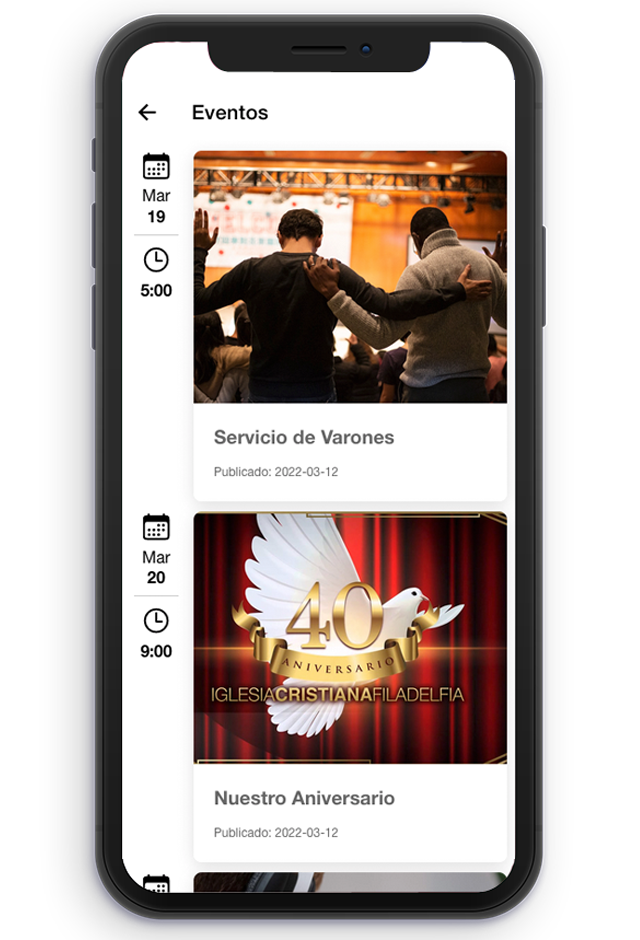 La aplicación móvil tendrá el logotipo y diseño de su iglesia, el cual podrá cambiar en cualquier momento desde la sección administrativa.